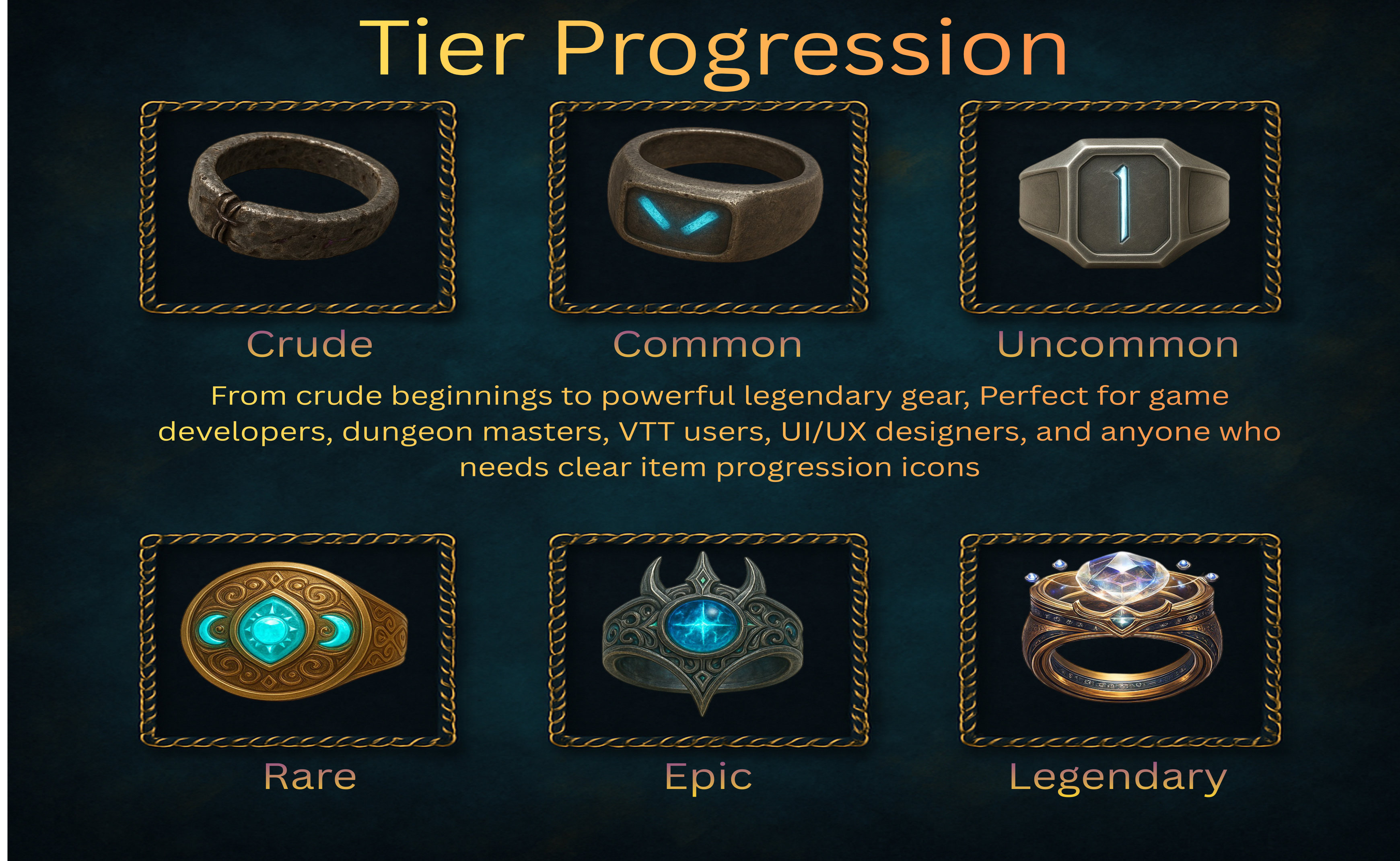 This digital asset pack is designed for fantasy games, RPG systems, VTT platforms, inventory UI and prototype development.